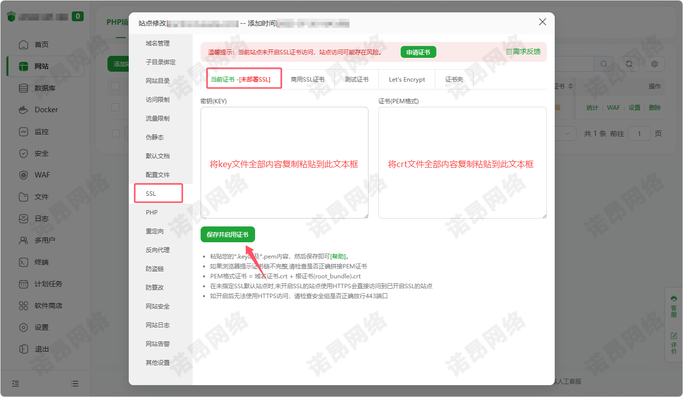 • ​证书密钥(KEY)​​:用文本编辑器打开 nuoang.com.crt.txt​ 文件,将全部内容复制粘贴到此文本框内。