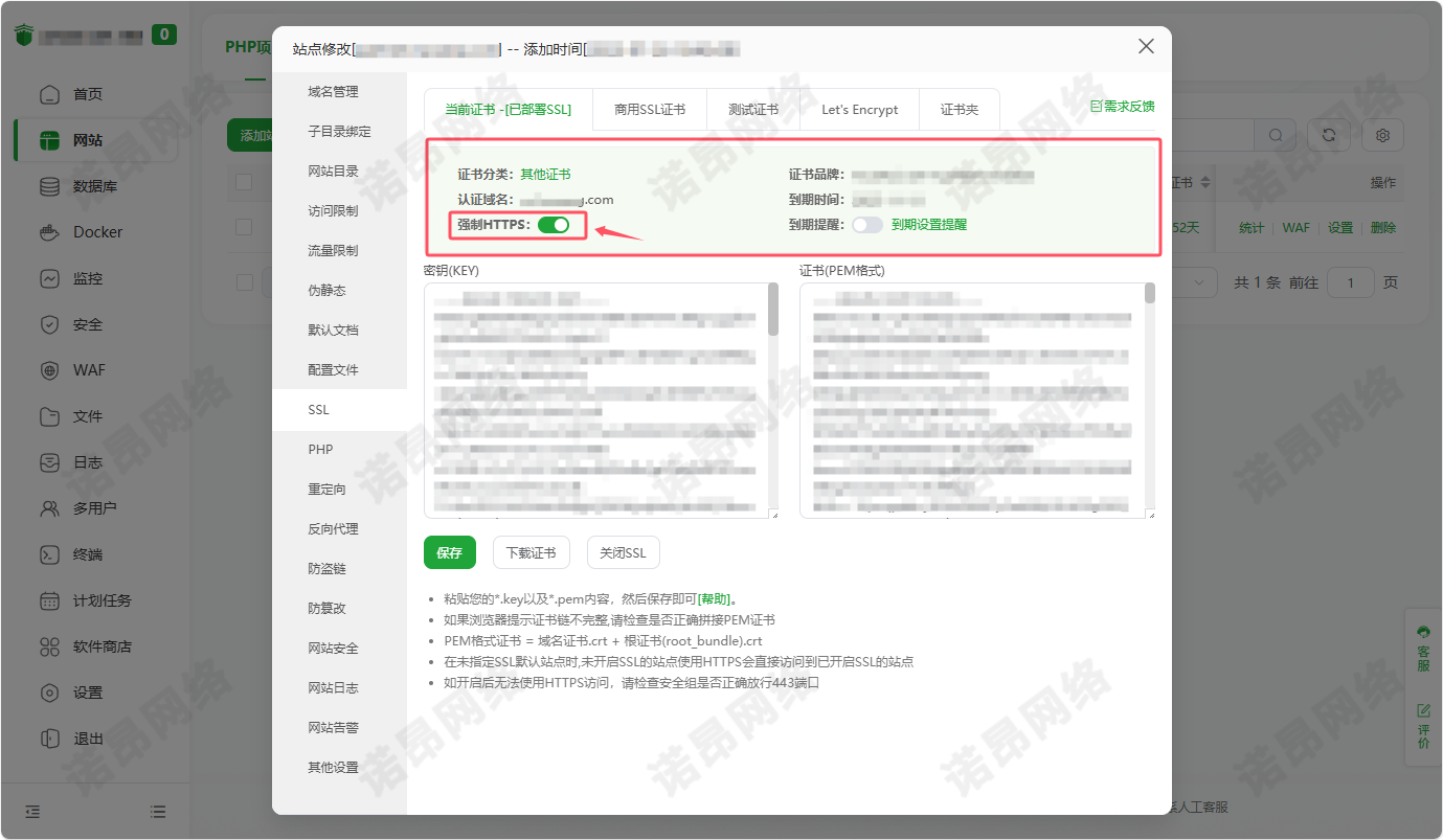 保存证书后,页面上会出现 ​​【强制HTTPS】​​ 的开关选项。​​请立即点击开启​​。
