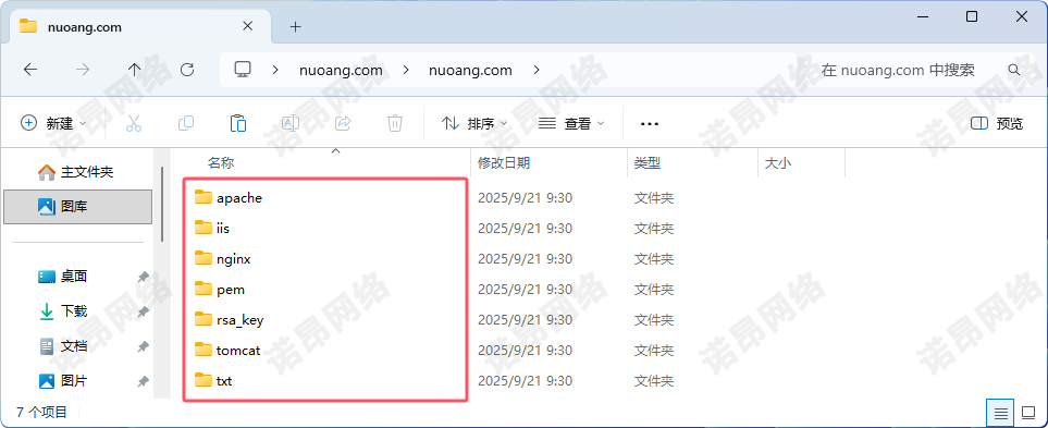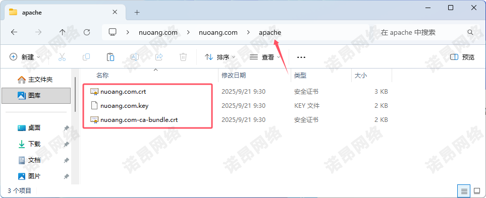 针对Apache服务器配置,以诺昂网络下载的证书为例,您将需要使用 apache 文件夹内的三个文件: