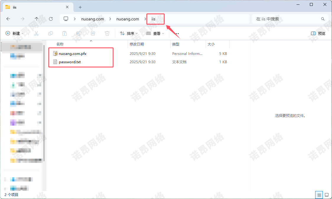 针对IIS服务器配置,以诺昂网络下载的证书为例,您将需要使用 IIS 文件夹内的两个文件: