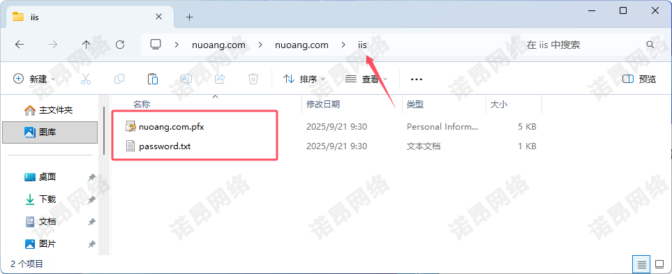 针对IIS服务器配置,以诺昂网络下载的证书为例,您将需要使用 IIS 文件夹内的两个文件: