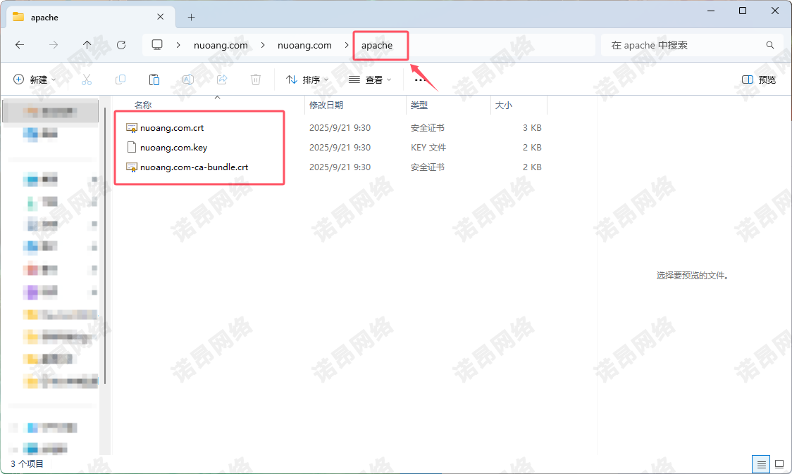 针对Apache服务器配置,以诺昂网络下载的证书为例,您将需要使用 apache 文件夹内的三个文件: